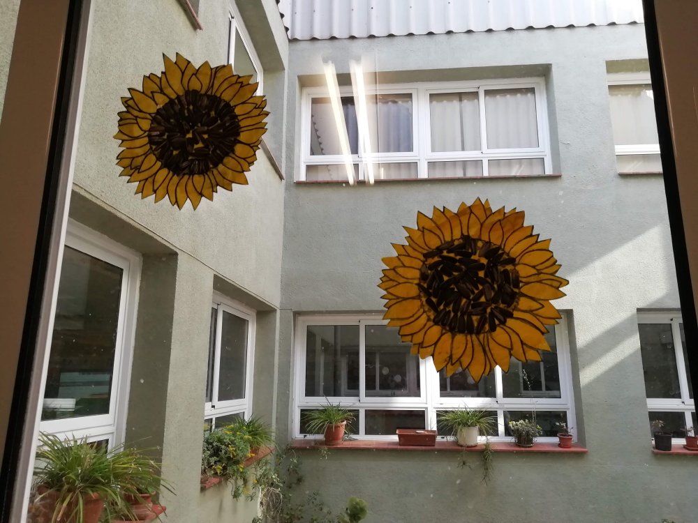 Com que els hi va agradar tant l’activitat, vam decidir decorar l’aula amb gira-sols. Primer els van pintar amb pintura groga i després hi van enganxar pipes de gira-sol.