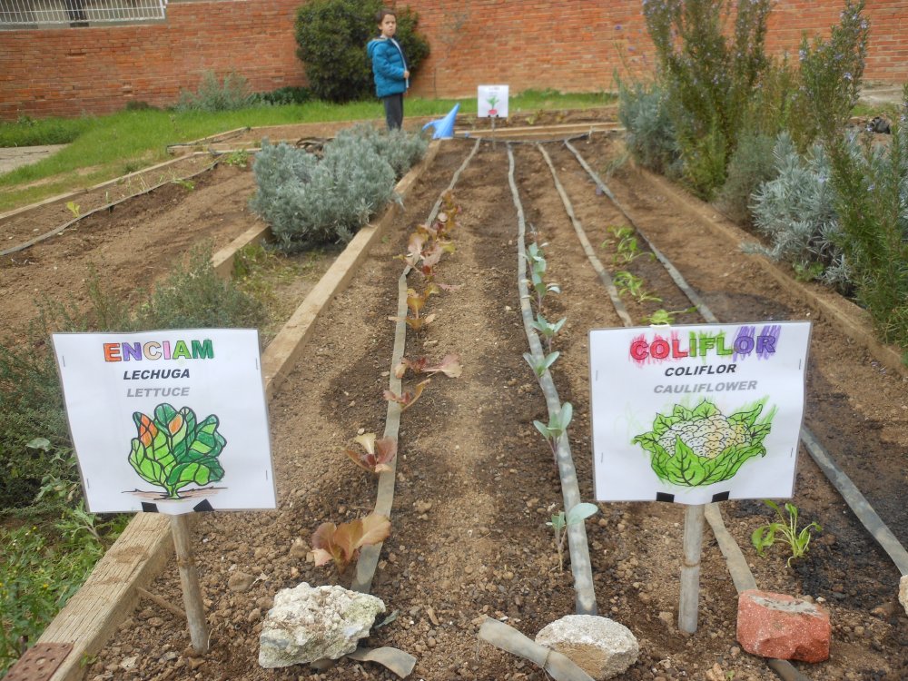 Aquesta setmana hem fet cartells per senyalitzar el que hem plantat a l’hort, amb el nom de les plantes escrit en tres llengües: català, castellà i anglès.  Hem fet un forat a terra i hi hem clavat els cartells.
