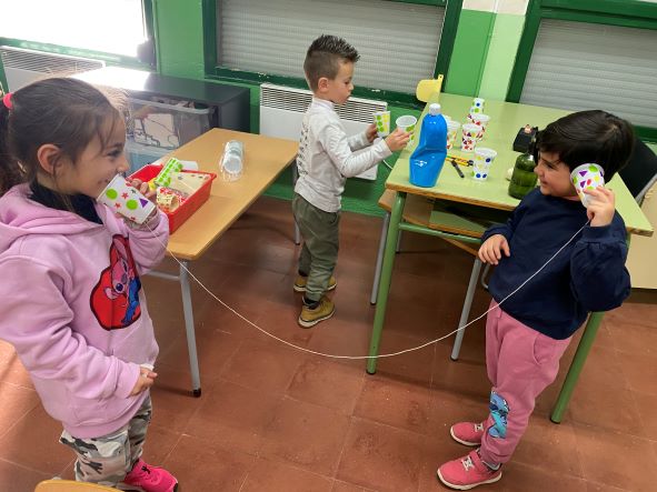 A LA SESSIÓ D’AVUI ELS INFANTS HAN POGUT COMPROVAR COM LES ONES DE LA NOSTRA VEU “VIATGEN” D’UN GOT A UN ALTRE A TRAVÈS DEL FIL. SEMBLA MÀGIA!