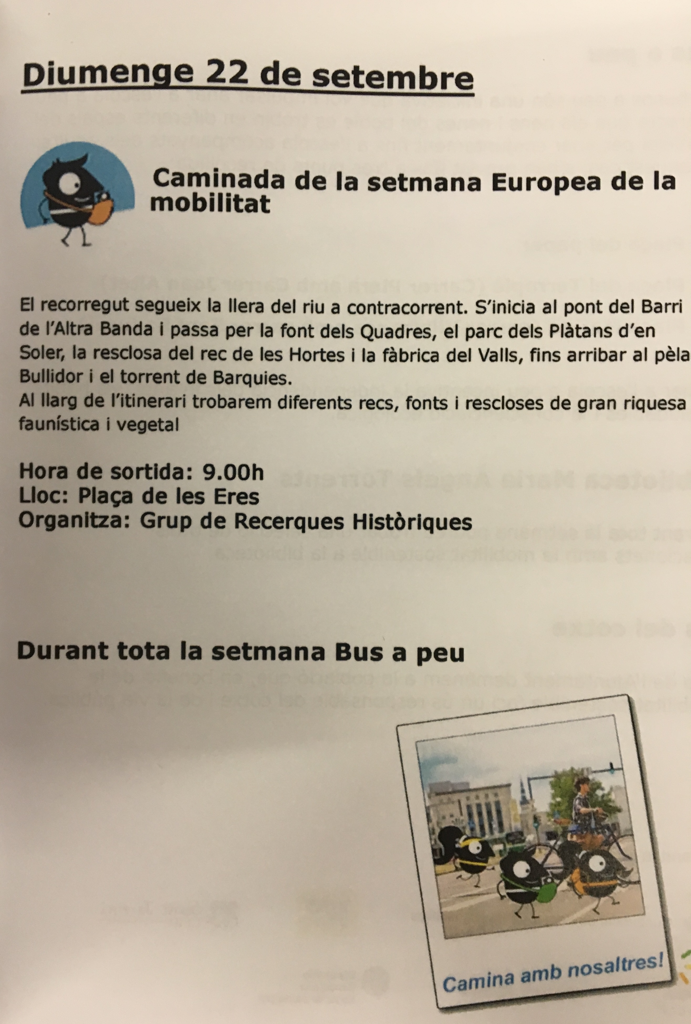 Del 16 al 22 de setembre se celebra a Catalunya la Setmana Europea de la Mobilitat que promou hàbits de mobilitat més sostenibles, segurs i saludables com són els desplaçaments a peu, en bicicleta, en transport públic o amb vehicle elèctric, així com visualitzar els canvis possibles en l’ús de l’espai públic, millorar la qualitat de l’aire i la reducció de la contaminació. Amb el lema ‘Camina amb nosaltres!’, la Setmana del 2019 ens anima a moure’ns de manera sostenible, saludable i segura: caminar o anar en bicicleta són activitats beneficioses no només per a la nostra salut i per al medi ambient, sinó també per la nostra butxaca!