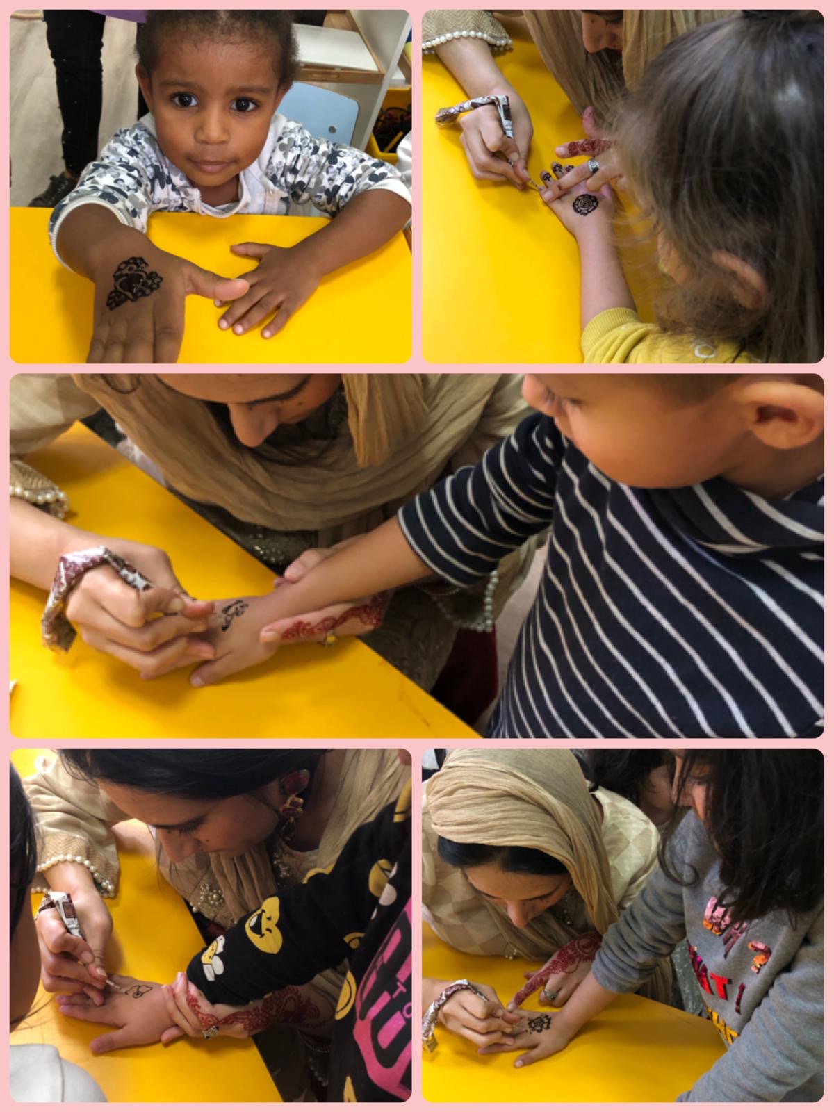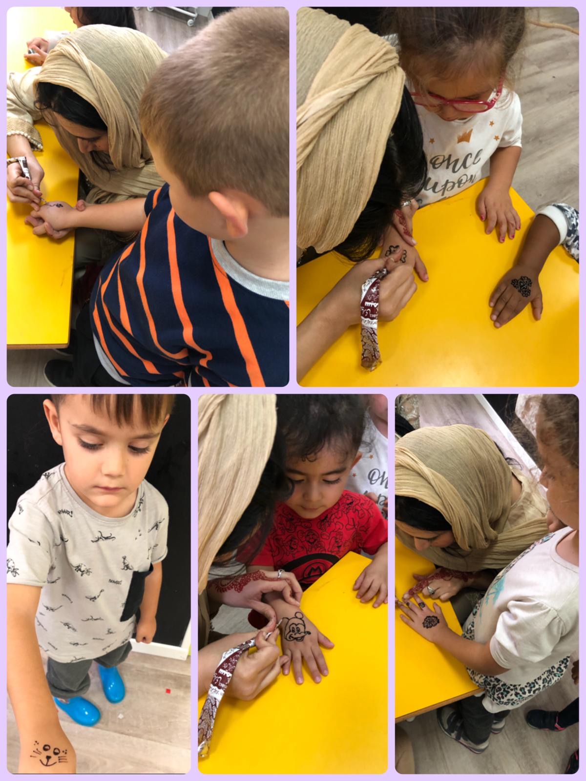 Aquesta setmana, les nenes i els nens d’infantil vam poder gaudir d’una tarda de tatuatges de Henna. Dues famílies de l’escola ens van explicar que per a la seva cultura, fer-se aquest tipus de dibuixos a les mans i braços era en motiu de celebracions o moments importants. Es fa amb una mena de tinta que s’anomena henna i que té un to rogenc ataronjat. Després van voler fer uns petits tatuatges als infants i com us podeu imaginar, les nenes i els nens encantats!!