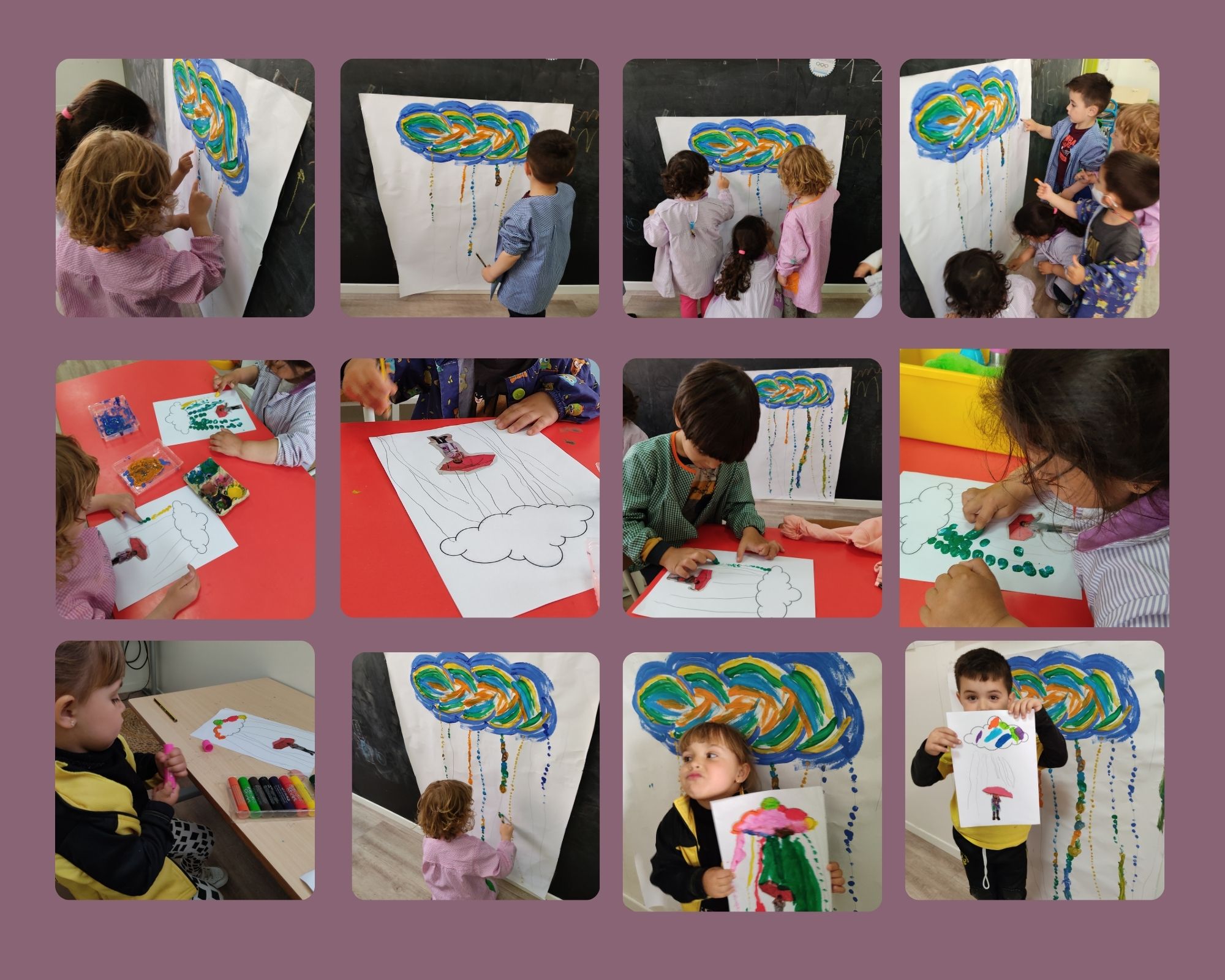 Un dia a l’escola va aparèixer un núvol de colors sense gotes de pluja. Quan vam saber la seva historia vam decidir fer-li les gotes de pluja plenes de colors (tot practicant la línia recta i el punteig).