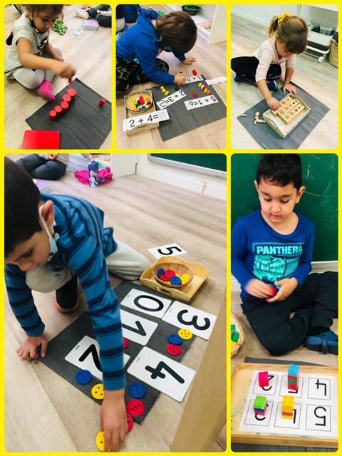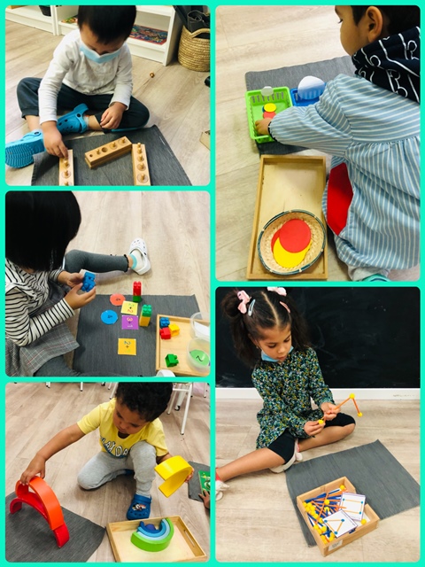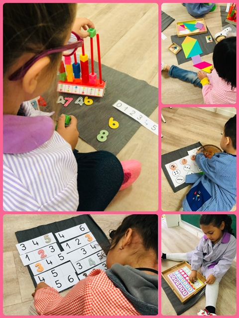 Treballem les formes geomètriques i la seva grandària classificant aquestes en safates, ens iniciem en les sumes fent servir ossets o torres, fem sèries de tardor, reforcem els nombres fent torres i/o posant tantes pinces com ens indica cada targeta o fem ordenacions amb els cilindres i confegim dibuixos amb el tangram.