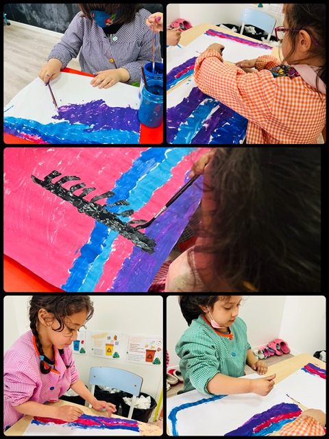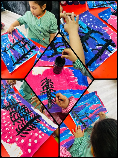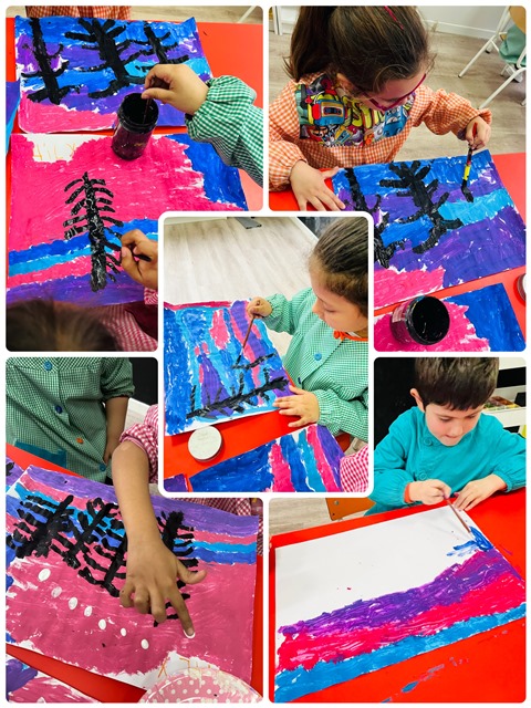 Per això hem fet uns paisatges d’hivern amb pintura fent servir els colors propis d’aquesta estació i, una vegada assecats, hem dibuixat uns arbres amb pintura negra i hem fet la neu blanca al voltant i pel terra… ens han quedat maquíssims!!!