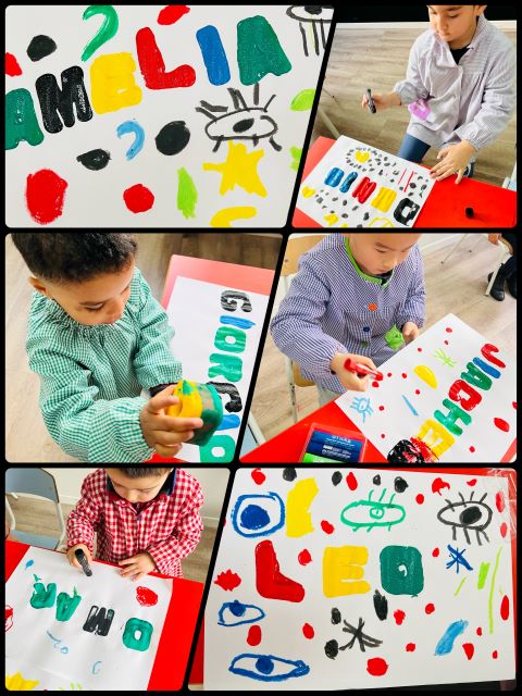 La classe dels pintors i pintores estem aprenent moltes coses sobre el gran pintor Joan Miró. Hem après que pintava quadres amb pinzells, els dits i les mans, que els seus colors preferits són el blau, el vermell, el groc, el verd i el negre i que li agradava molt incloure a les seves obres línies llargues i curtes, primes i gruixudes, ulls, sols vermells, estrelles, llunes, lletres, números i cercles negres.