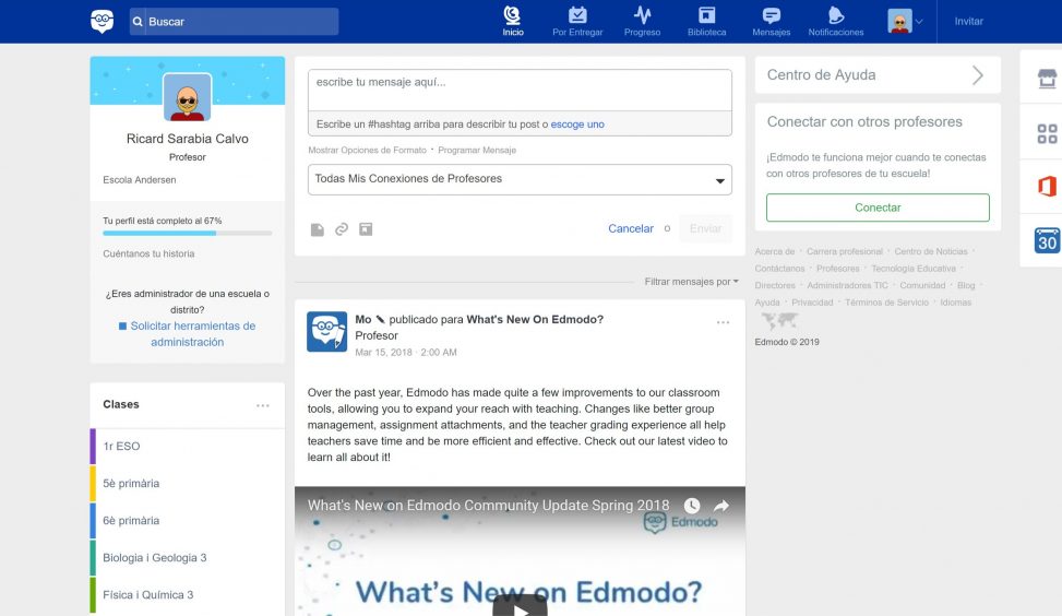 Aquesta xarxa a més ens permet connectarnos a eines molt i molt útils com a office365, edpuzzle o symbaloo, és a dir, una xarxa totalment educativa i vinculada a eines de treball. Què millor que compartir coneixements amb els companys de classe en format facebook?