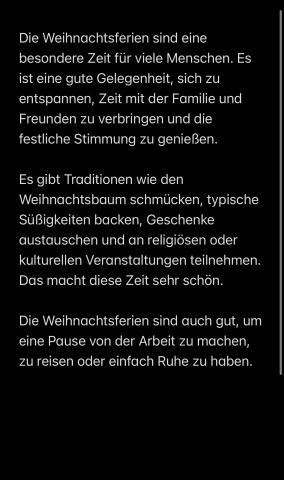 Ich war letzte Woche im Zoo. Ich ging mit meinen Eltern. Ich habe exotische Tiere gesehen. Das Tier, das mir am besten gefiel, war das Zebra. Die Giraffen waren hübsch. Das Tier, das meinen Eltern am besten gefiel, war der Tiger. Der schönste Moment war, als ein Affe mit uns spielte. Ich hatte an diesem Tag eine tolle Zeit. Ich würde wieder in den Zoo gehen.