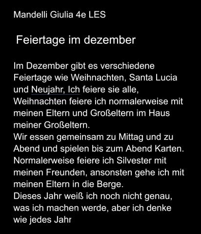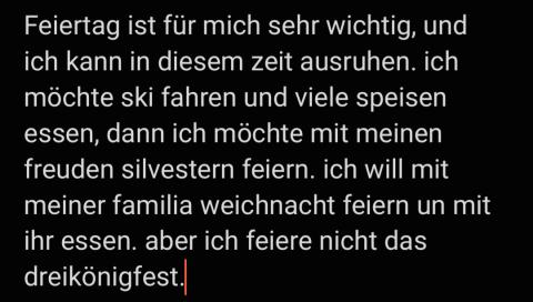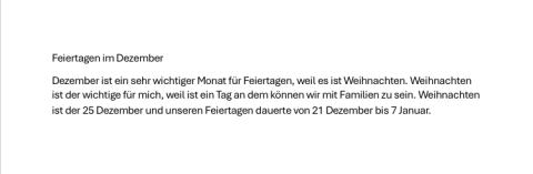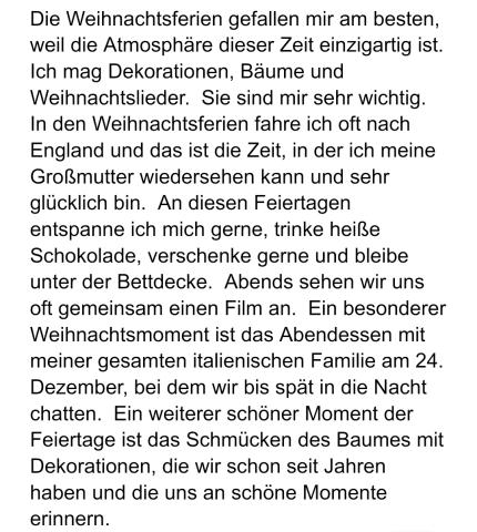 Neulich ging ich mit meiner Familie in den Zoo.Ich sah viele Tiere. Am besten gefallen mir die Raubkatzen, wie Tiger, Panther, Leoparden und Löwen. Aber am meisten beeindrucken mich die sehr großen Tiere, wie Elefanten und Giraffen.Der Höhepunkt des Tages war die Vorführung von tropischen Vögeln. Sie vollführten Purzelbäume und akrobatische Kunststücke.Es gab sie in vielen Farben, aber mein Favorit war gelb und blau. Es war ein großartiger Tag.