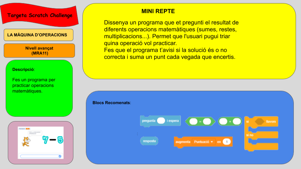 MRA11. La màquina d’operacions Fes un programa per practicar operacions matemàtiques. https://scratch.mit.edu/projects/401291524