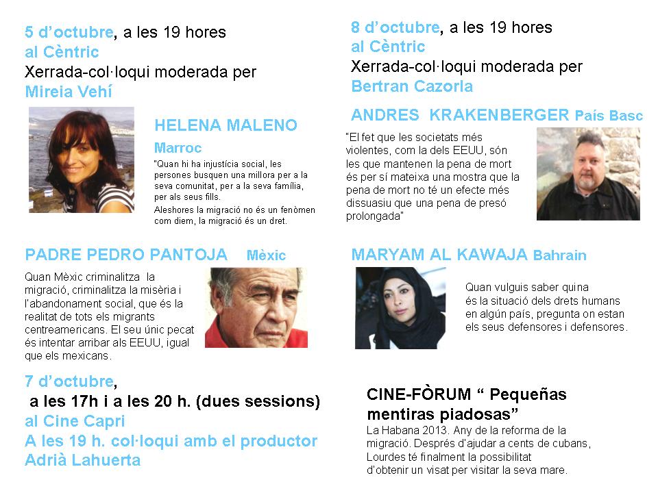 El dijous 9 d’octubre al matí,  exclusivament per a l’alumnat de secundària,  s’ofereix una activitat al Cèntric sobre la lliure circulació de les persones, el dret a la vida i el dret a la llibertat d’opinió i d’expressió que comptarà amb la participació d’Helena Maleno i el Padre Pedro Pantoja.