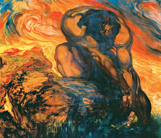 Explica Jacint Verdaguer a l’Atlàntida que Gerió, un gegant de tres caps va envair Ibèria, derrotant a Túbal, el rei. Pyrene, la filla de Túbal, en veure que passava va marxar a amagar-se al bosc, i Gerió la va intentar matar perquè tenia por de que reclamés el tron. Va calar foc a totes les muntanyes i va marxar.