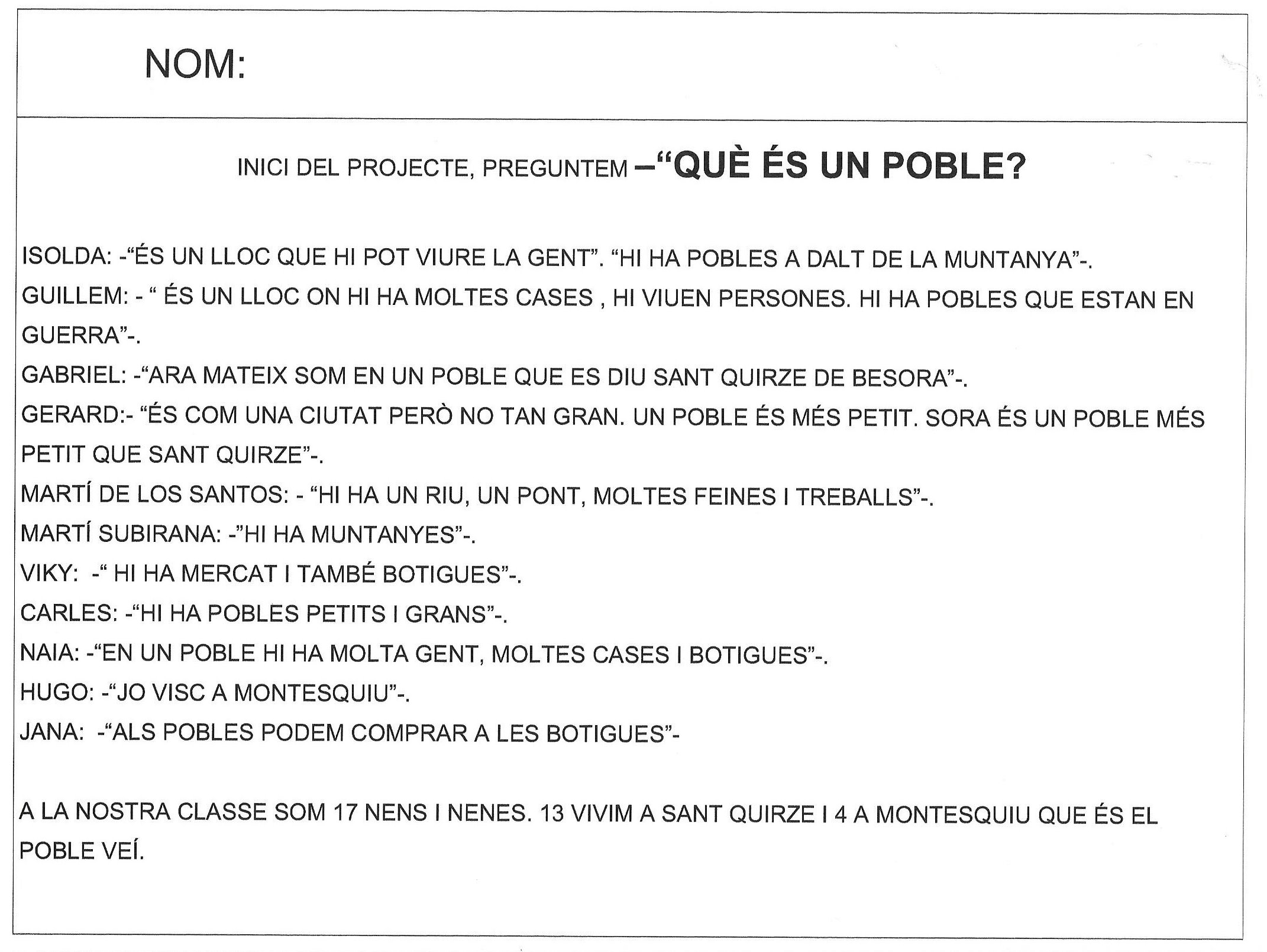 A EDUCACIÓ INFANTIL HEM INICIAT EL PROJECTE EL POBLE. ELS DINOSAURES HEM COMENÇAT CONVERSANT SOBRE “QUÈ ÉS UN POBLE ?” “QUÈ EN SABEM”. I FIXEU-VOS SABEM MOLTES COSES, HEM RECOLLIT TOTES LES APORTACIONS