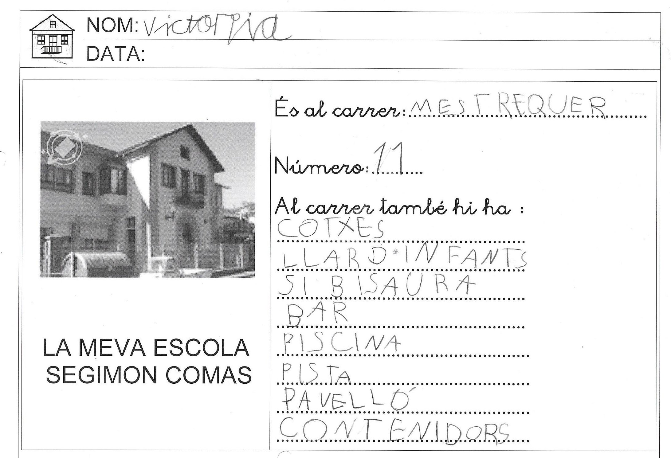 VOLEM SABER EL NOM DEL CARRER DE L’ESCOLA I EL NÚMERO. HEM SORTIT AL CARRER PER VEURE SI TROBEM EL NOM DEL CARRER. FINALMENT HEM TROBAT UN CARTELL QUE DIU “CARRER MESTRE QUER” HEM FET UNA FOTO I A LA CLASSE HEM APUNTAT EL NOM. ARA ENS FALTA SABER EN QUIN NÚMERO ÉS L’ESCOLA. HEM TROBAT EL NÚMERO “11” A PROP DE LA PORTA D’ENTRADA DE CICLE MITJÀ. TAMBÉ ENS HEM FIXAT EN LES COSES QUE HI HA AL CARRER….