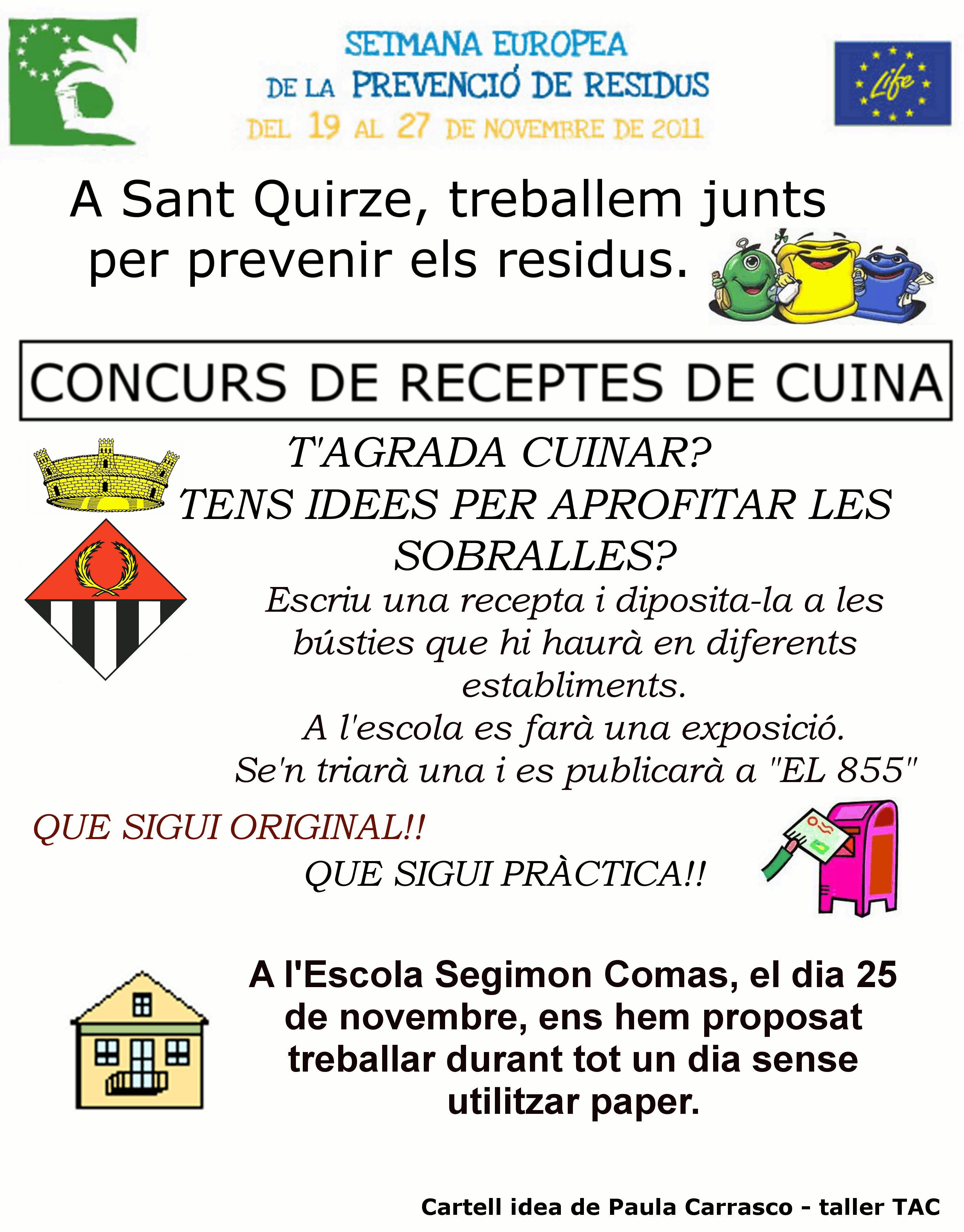 Un altre curs ens proposem participar en la Setmana Europea de la Prevenció de Residus com una actuació del Programa Escoles Verdes i com a mostra del nostre compromís per viure en un món més sostenible. Aquest curs escolar ens hem proposat iniciar actuacions dins l’àmbit local i l’Ajuntament i l’escola hem treballat junts per organitzar un ventall d’activitats.Els alumnes del comitè d’Escoles Verdes volem reduir els residus a l’escola i ens hem proposat fer diferents activitats per col.laborar en la Setmana Europea de la Prevenció de Residus. Us presentem el cartell que anuncia algunes activitats.