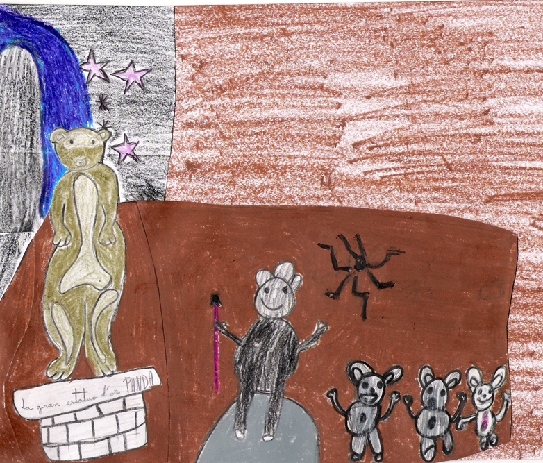 Els tres petits ossos pandes, no van fer cas al que els hi deia el vell Panda, i va tocar l’estàtua d’or. Llavors, cada vegada es podien moure menys fins que es van convertir tots tres en figures de pedra.