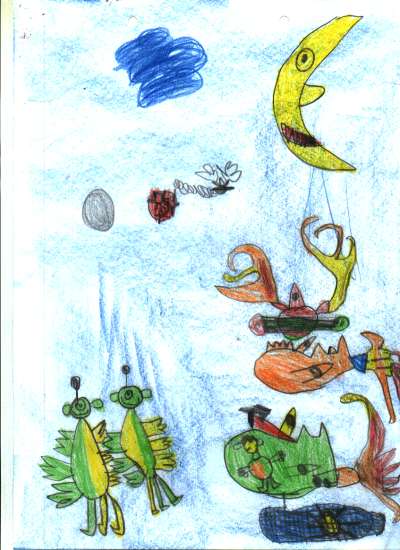 p5.jpg…..i es van quedar amb la boca oberta.Els nostres saturians tenien por, però també eren valents!!!!…i,a més a més ,necesitàven el sol solet per a ells i el seu planeta… Així que abans de que els galaxians diguéssin res, van proposar ells una solució pacífica…(perque tampoc volien guerres!)I amb un somriure dolç, per allò de posar calma,van començar a parlar:Com que ells tenien molts sols (i per això el seu planeta era ben vermell) potser podien regalar-ne un…i així els farien contents i sentirien molt d’amor i serien bons amics….Amor? Amics?…els galaxians mai havien sentit parlar d’això!I, amb molt bon criteri, van decidir que podien fer una festa i regalar el sol…i provar a veure que era això de l’amistad.I vet aquí un marcianitu ,vet aquí una nau…que aquest conte…..aixeca el vol!