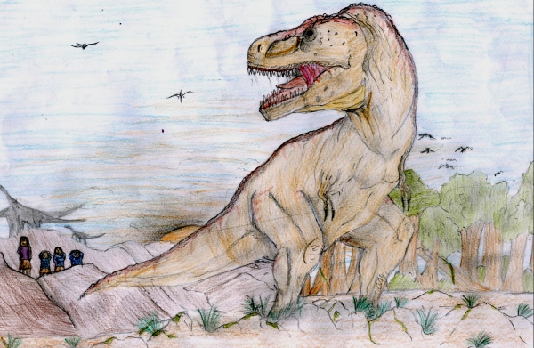 Ens vam ficar a l’aigua amb la manada de dilophosaures i d’entre els arbres va sortir un enorme tiranosaure!! Era molt ràpid,rapidíssim. Va sortir una serp enorme de l’aigua i va començar a barallar-se amb el tiranosaure. La serp el va arrosegar fins l’aigua va ser llavors quan el tiranosaure li va mossegar al coll deixant-la mig morta. Quan vam veure que el tiranosaure li mossegava el coll,vam decidir sortir corrents cap a la muntanya més alta però el tiranosaure va sortir de l’aigua i ens va començar a perseguir…