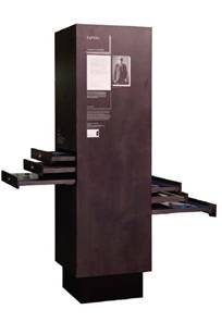 El muntatge consisteix en un pilar de 4 cares. En dues de les cares es desenvolupen els dos temes (ceguesa i silenci) i en les altres trobem la presentació de l’exposició i un punt sonor. Els temes es mostren a partir de les calaixeres, on el visitant trobarà les fitxes Espriu, els poemes, citacions d’ ell i d’altres autors acompanyades d’imatges que desenvoluparan el contingut. La instal·lació es completa amb un punt sonor on podrem sentir la veu d’Espriu. Es completa amb una mostra de bibliografia de l’obra i al voltant de l’autor.