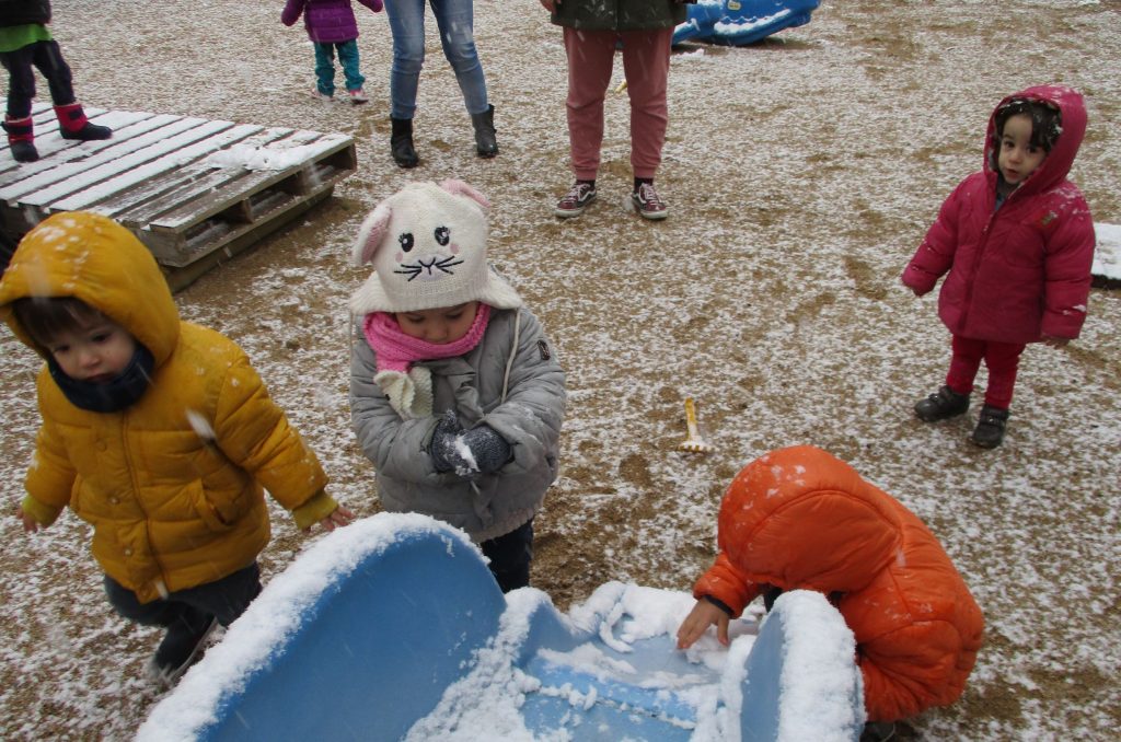 A poc a poc, la neu es va començar a veure al terra i, en acabar l’horari d’entrada a la llar d’infants, vam sortir un moment amb els nens i nenes! Varem deixar que la neu ens caigués una mica a sobre; varem veure com els flocs ens tocaven la mà, el cap i la cara; i miràvem com els flocs queien al terra, s’hi quedaven una estona i, finalment, el mullaven.