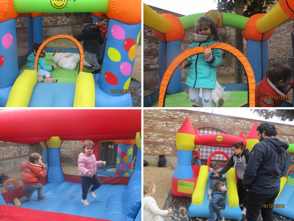 Desprès vam sortir al pati. Alguns pares havien muntat els castells inflables i els nens i les nenes van córrer a enfilar-s’hi de seguida! Mentrestant, la resta de famílies van preparar la taula sota la carpa amb l’esmorzar, que estava boníssim!