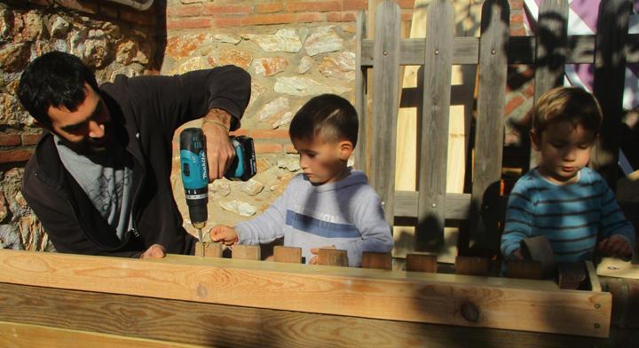 Quan ja tenien l’estructura força feta, els pares van començar a treballar “in situ”: al lloc on s’havia de col·locar la cuineta, dins el pati. Val a dir que van tenir molta paciència perquè la curiositat dels infants els va dur a treballar envoltats d’ells… Sempre van tenir cura perquè no fos perillós per a la mainada i atenció per explicar i ensenyar el que fèien, i fins i tot per pemetre que els ajudessin!