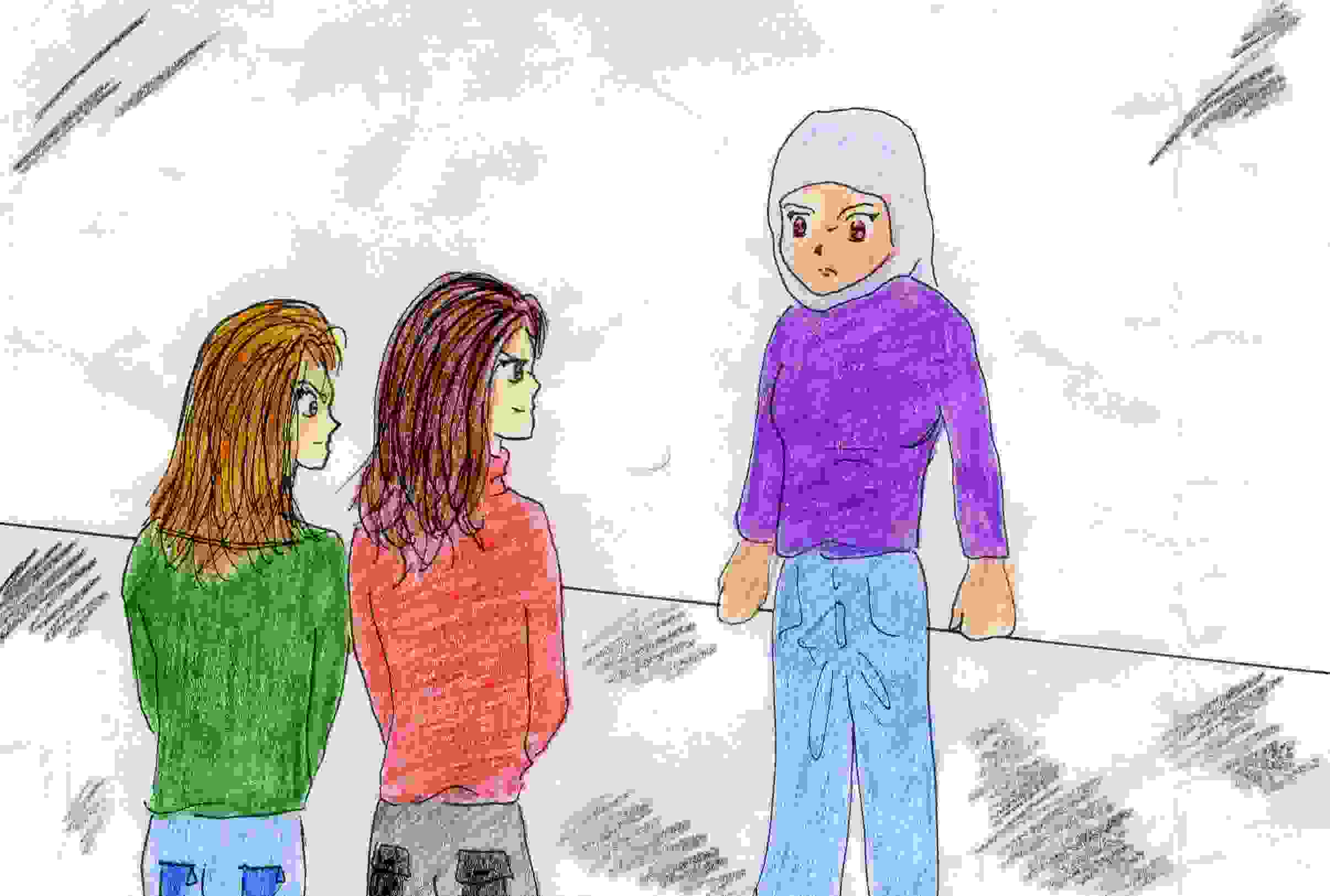 Dues noies assetjen a una noia musulmana a l’institut per culpa de la seva religió. La noia musulmana defensa les seves idees, i una altra noia defensa aquestes idees. Finalment, les dues noies racistes deixen en pau a la noia musulmana, i aquesta li agraeix la seva ajuda a la noia defensora.