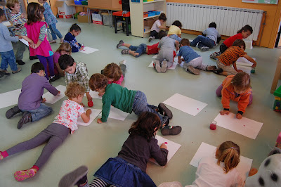 Finalment una última activitat que vam realitzar la setmana passada: una experiència musical. Només arribar, la Marta ens va explicar que repartiria pots de pintura pel terra i que posaria una audició musical. A partir d’aquesta, hauríem de dibuixar sobre un full en blanc el què ens vingués el cap escoltant-la.