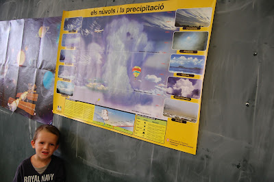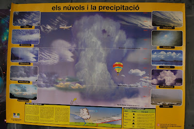 [ El Dalmau ens explica el póster, on podem veure els diferents tipus de núvols segons l’alçada on estan del cel. Coneixem el Cirrus i el Nimbostratus, entre d’altres. També ens explica que a la part més alta només hi arriben els avions i els coets ]