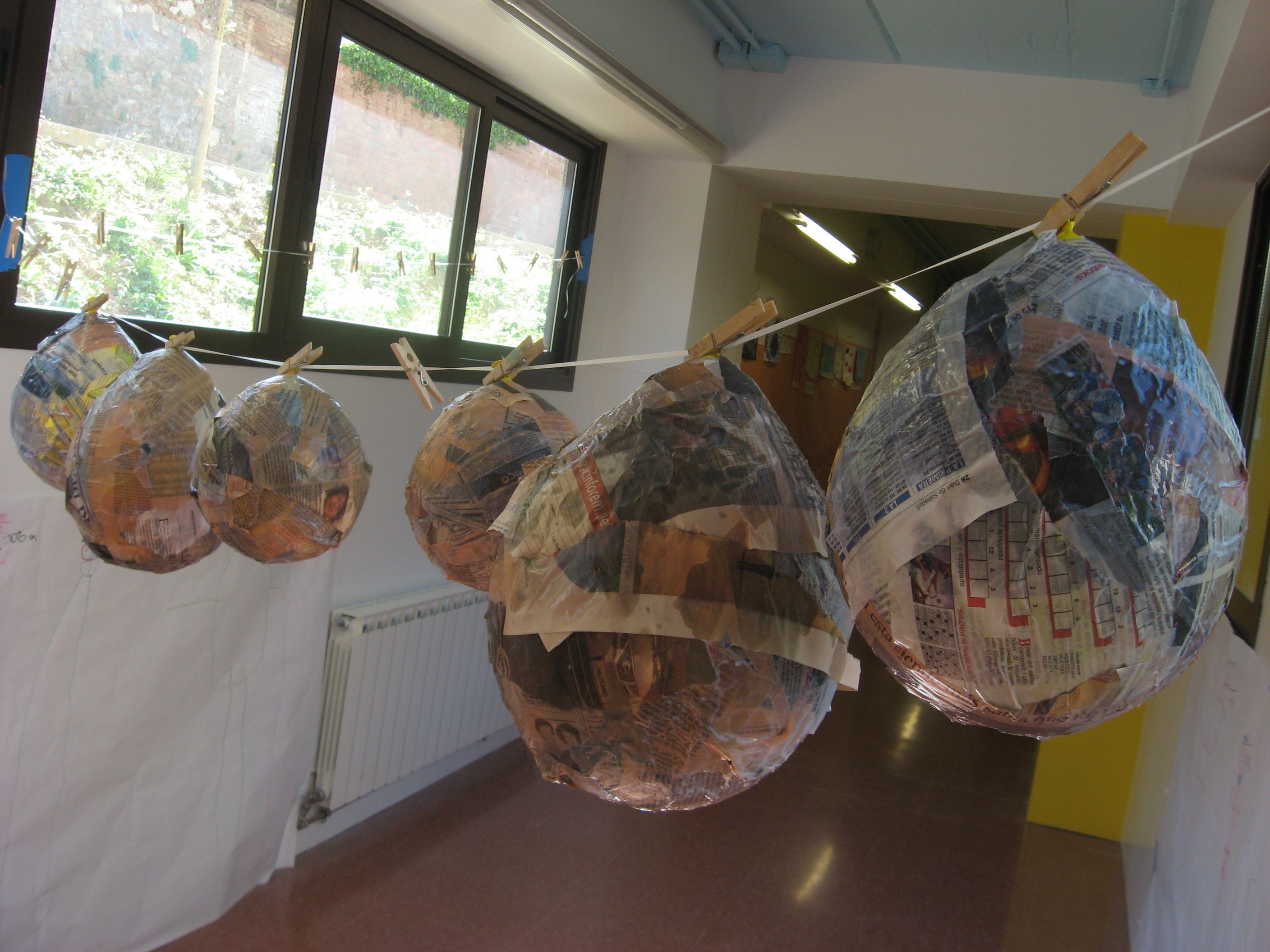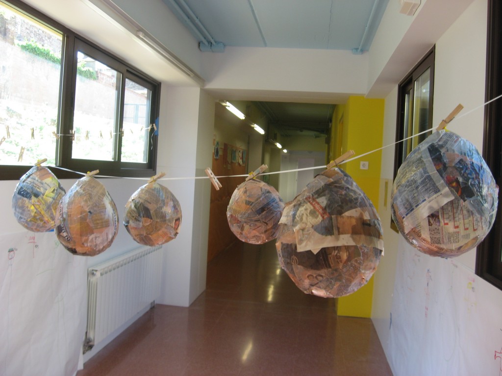 Per aquest motiu, i tal com vam quedar amb els núvols, avui hem començat a fabricar els nostres planetes per crear l’univers a l’aula! Hem agafat paper de diari i n’hem fet tires. A continuació, hem inflat vuit globus i els hem vernissat amb el paper de diari, creant una capa al voltant del globus. Evidentment, abans de tot aquest procés hem estat parlant de quins planetes són més grans, quins més petits, de quin tamany faríem la Terra, etc.