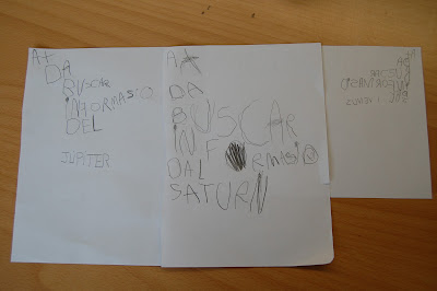 Un cop hem escollit el planeta (o estrella o satèl·lit) havíem de fer alguna cosa per informar-ne a les famílies… els núvols han decidit que escriurien quin planeta havien d’investigar i hem buscat una frase entre tots: “Haig de buscar informació del…”. Així que entre tots hem escrit la nota. Com que ens ha faltat temps, perquè anem a poc a poc fixant-nos amb totes les lletres, la Marta ha escrit els planetes que havíem triat en algunes notes informatives.