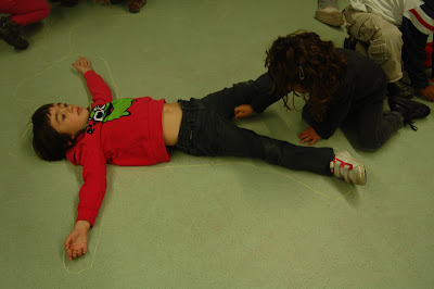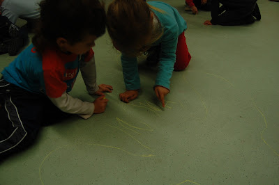 Així ho hem fet!! Hem triat el nen i la nena més baixets de la classe, perquè ens hi capigués el seu cos en el paper d’embalar i hem decidit que anirem formant el cos de cadascú, perquè els núvols tenen molt clar que el cos femení i el masculí són diferents… ja investigarem si tenen raó o no…