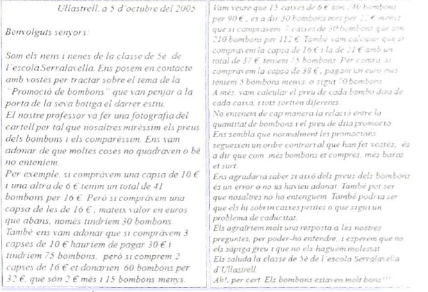Els nens resolen el problema mitjançant estratègies diferents: buscar el preu de cada bombó, saber quants bombons tenim per cada euro, comparant les caixes (si tinc 16 euros…). Un cop s’ha fet la posada en comú, s’expliquen els passos realitzats, generalitzant les eines (inclús podria ser una definició per penjar a la paret).