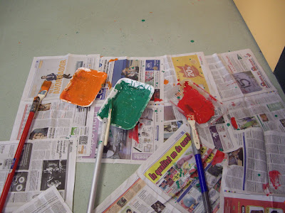 Primer hem hagut de decidir com ho fèiem per arribar fins tan a dalt, algú ha tingut la gran idea de fer una torre ben gran de construccions i pintar amb elles, però no tothom estava convençut que allò funcionés i per tant després de parlar-ne una estona algú ha completat la idea lli podem enganxar amb pegamento un pinzell a la punta. No era una mala idea, però hem buscat alternatives. Poc després algú ha proposat de buscar una escala, al principi no sabíem on la podíem buscar, però finalment algú molt encertat ha dit quan estàvem a P3 la Amàlia tenia una escala gran. Així tots hem anat a buscar a l`Amàlia al seu despatx i li hem demanat l’escala, però ooooooh! ens ha dit que aquí al cole nou no en té cap, però que el David si que en té una. Tots plegats hem anat a buscar a al David i li hem demanat l’escala, però ens ha dit que era molt petita i que tampoc no arribaríem. Però ens ha donat una altra idea “perquè no ho pinteu amb una escombra?” Dit i fet hem anat al menjador en busca d’una escombra.