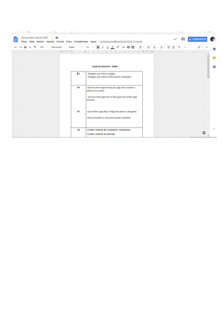 Per confegir aquest manifest es compartirá un document en xarxa, on hi havia una graella on cada classe escriu el seu desig. En aquest cas s’ha emprat l’aplicació google drive amb un document de text compartit