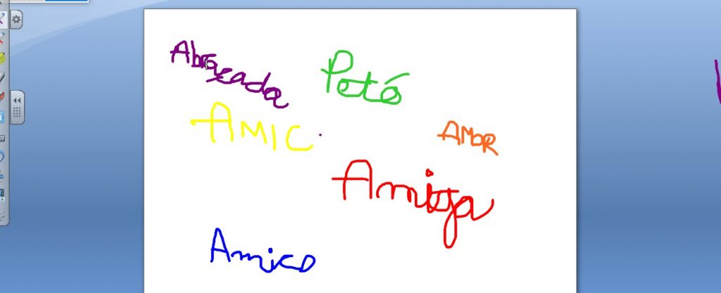 Una segona sessió consistirá en fer una llista, entre tots, de les paraules dolces que coneixem, escrivint en la pissarra digital i després les llegim en veu alta. A continuació, els infants es col·loquen per parelles i es diuen paraules dolcesa cau d’orella.