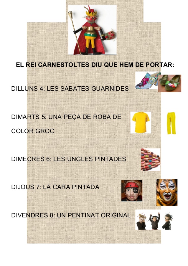 Parlarem del personatge principal del carnaval: el rei Carnestoltes, de les ordres i dels moments més importants de la festa: dijous gras, rua de carnaval i dimecres de cendra.