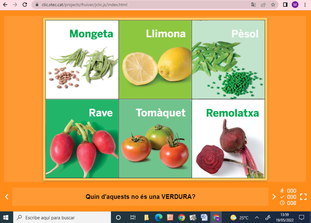 Aquesta activitat consistirà en jugar a la PDI amb el Jclic Fruites i verdures de Júlia Jiménez Quer. La finalitat d’aquesta ACTIVITAT INTERACTIVA és que els infants aprenguin a diferenciar les verdures de les fruites i al revés. El Jclic inclou diferents jocs com el joc del memory, jocs d’escoltar i d’identificar, trencaclosques, jocs de discriminar, etc.