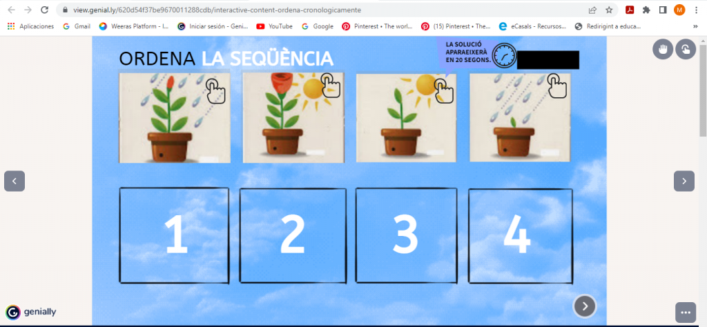 En aquesta activitat treballarem seqüències temporals relacionades amb la granja. Prepararem un GENIALLY amb diverses seqüències. Els infants sortiran per torns a la PDI i entre tots ordenaran els passos. Prepararem seqüències de com es planta una verdura, de com creix, del naixement d’un pollet, del creixement d’un fruit, de fer un suc de taronja, etc., i amb diferents nivells de dificultat. Tota seqüència anirà recolzada per l’explicació de la mestra perquè tots els nens i nenes l’entenguin.