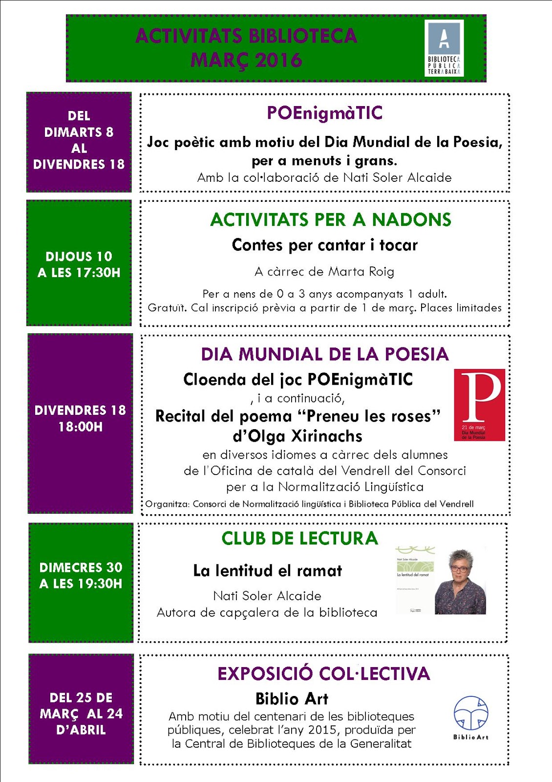 Clicant en aquest enllaç podreu veure les activitats que la biblioteca del Vendrell a preparat per al mes de març:
