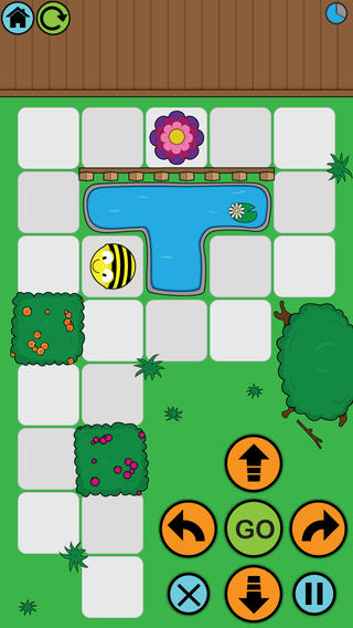 En l’app cal programar una abella amb una seqüència d’ordres (endavant, endarrera, dreta i esquerra) i després cal confirmar-les (botó go) per tal que executi les instruccions en l’ordre introduït. El repte és programar tots els moviments necessaris per arribar a la meta programant-la una sola vegada.