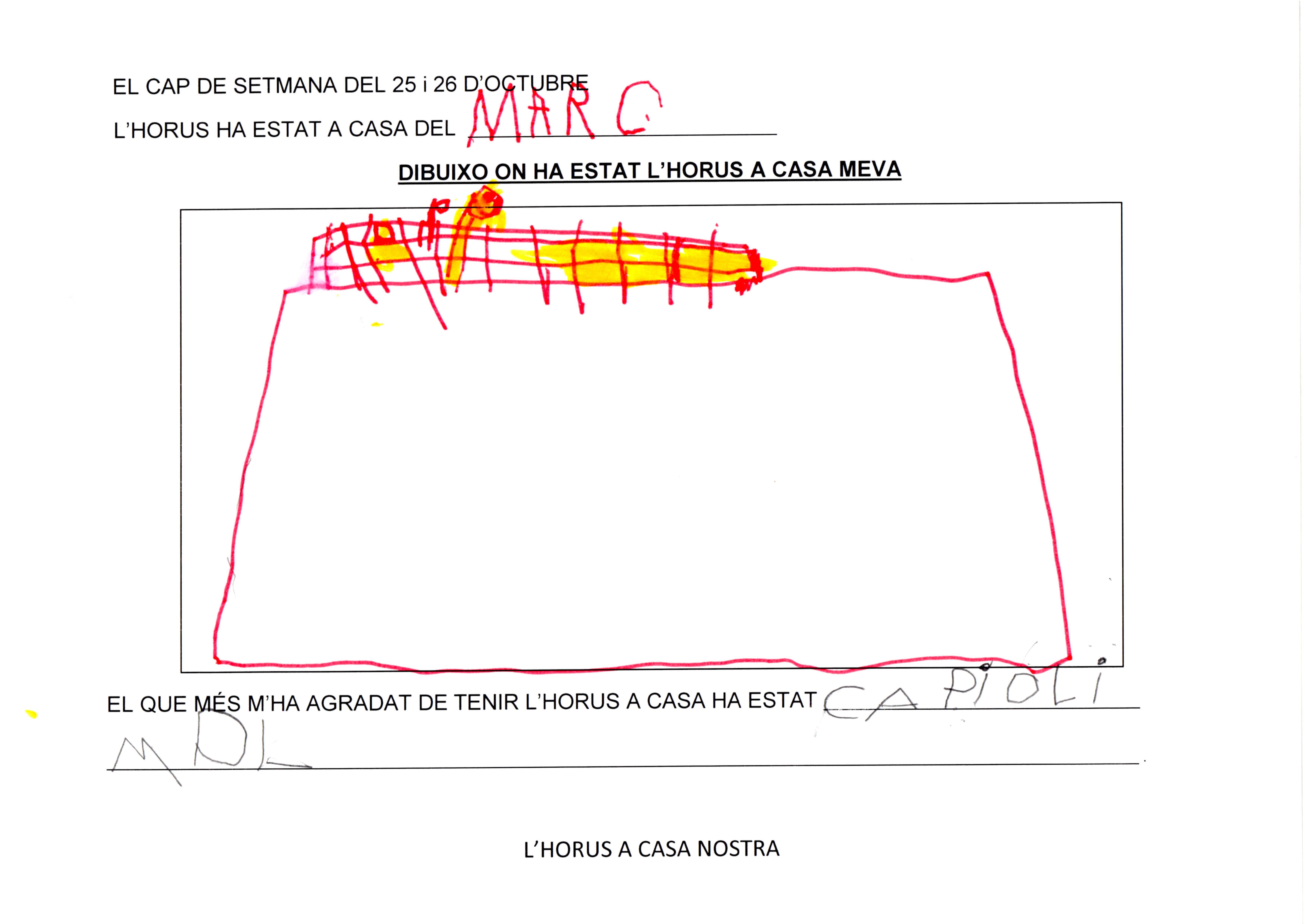EL MARC HOLA SÓC EL MARC, EM VAIG EMPORTAR L’HORUS A CASA ELS DIES 25 I 26 D’OCTUBRE. HE FET AQUEST DIBUIX I TAMBÉ PODEU VEURE LA FOTOGRAFIA AMB L’HORUS I EL MEU GERMÀ.