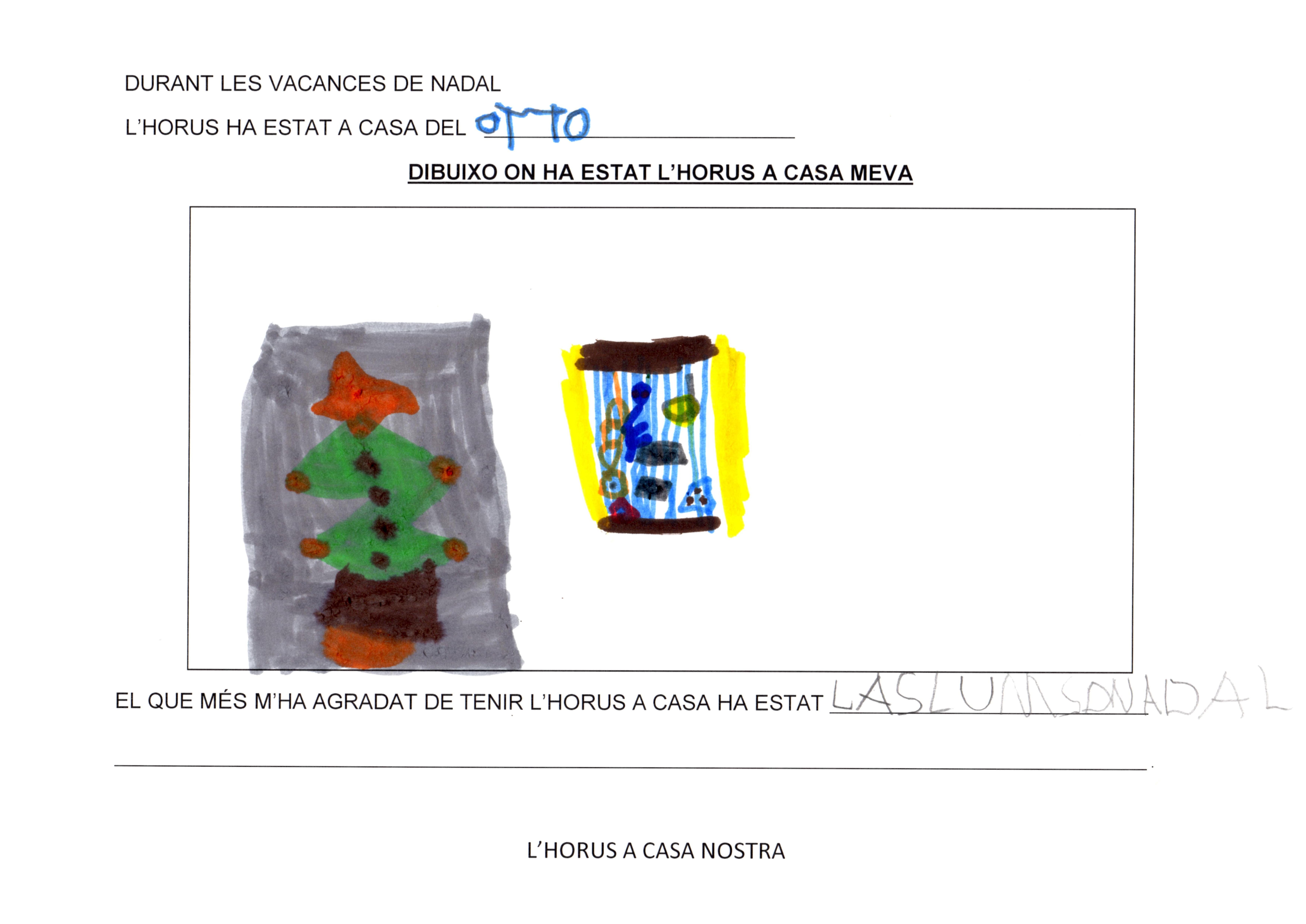 L’OTTO HOLA, SÓC L’OTTO, HE TINGUT L’HORUS A CASA DURANT TOTES LES FESTES DE NADAL,, S’HA PORTAT MOLT BÉ I JO HE TINGUT CURA D’ELL AMB LA MEVA FAMÍLIA. HE FET AQUEST DIBUIX I TAMBÉ EM PODEU VEURE AMB L’HORUS A LA CLASSE.