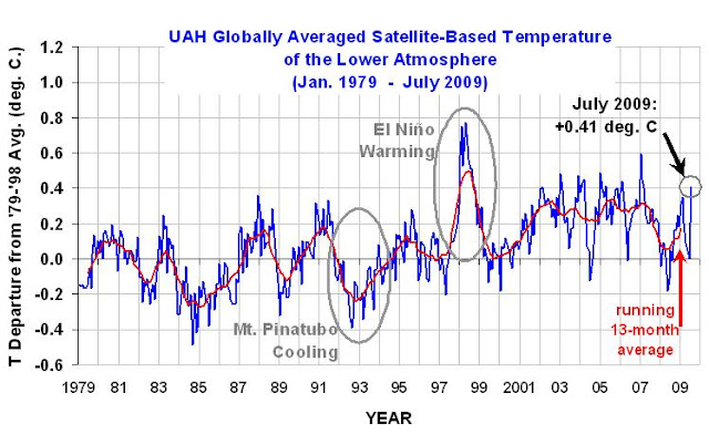 Es pot veure que no hi ha cap tendència a l’alça amb les temperatures, pel que sembla que els increments de CO2 no influeixin gaire amb l’evolució de la temperatura i sí tingi més a veure la poca activitat solar que hi ha ara mateix. La gran pujada del 1998 va coincidir amb el fenòmen de “El niño”, una anomalia climàtica que afecta molt a les temetarures a nivell mundial.
