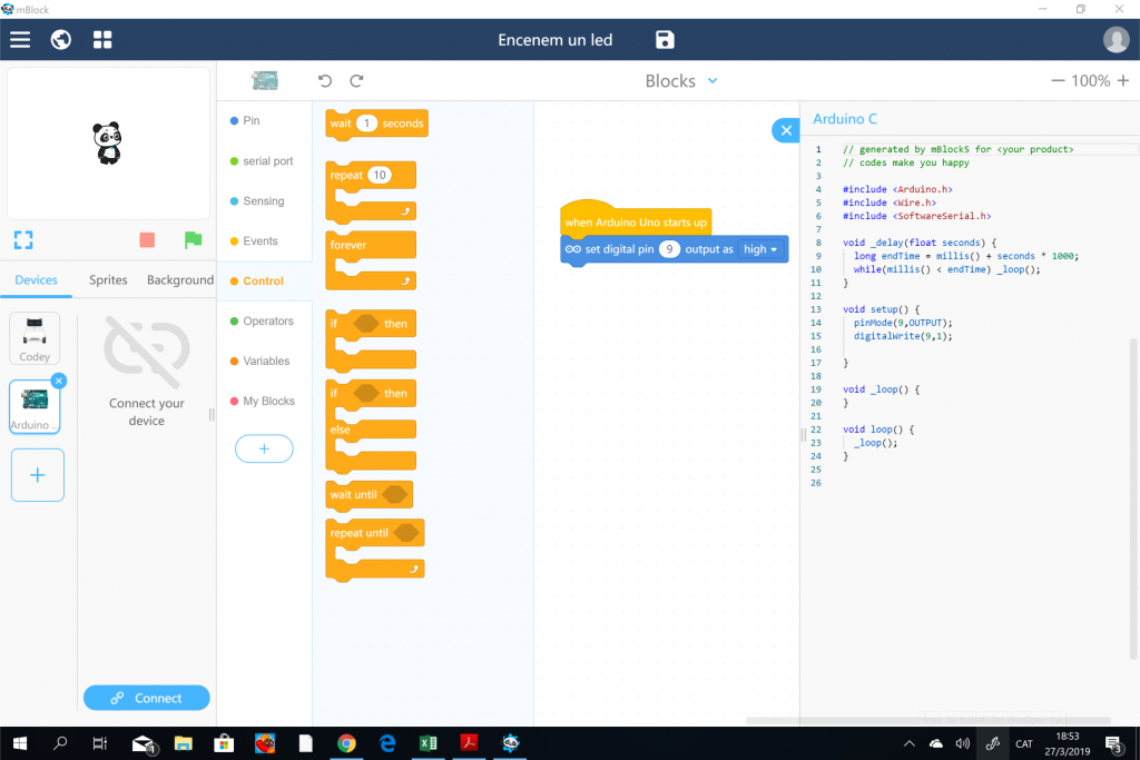 Codi inicial per encendre un led amb mblock