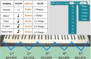 Utilitzant l’mblock tenim blocks que ens faciliten la configuració del brunzidor. En el bloc «play tone» podem seleccionar una nota en notació anglosaxona de les cinc escales d’un piano.