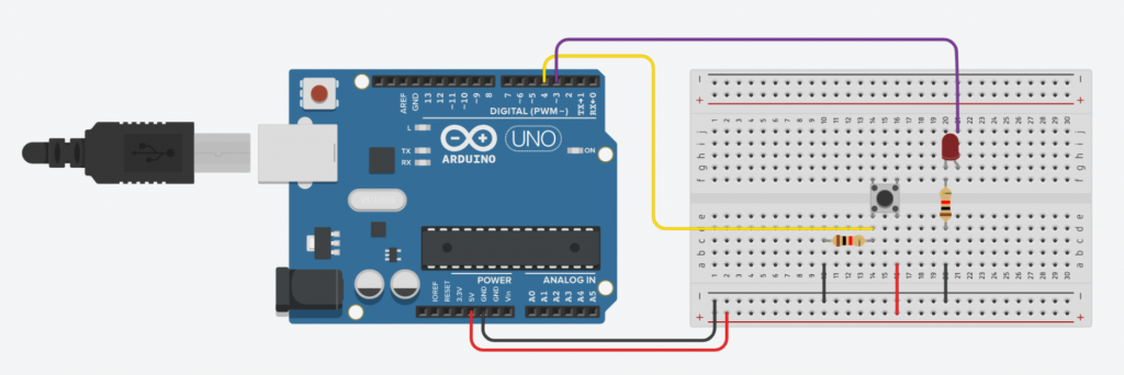 - El cable groc va desde el pin4 d’arduino fins a una posició entre una clavilla del polsador i a una resistència de 1kΩ (configuració resistència pull up)