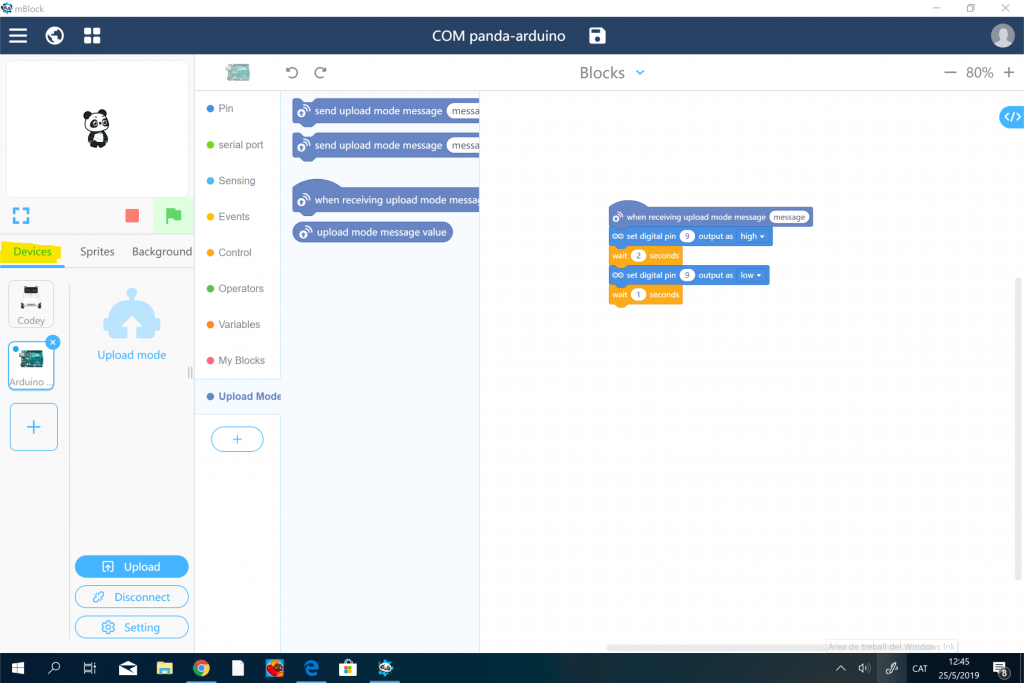 En la nostra placa d’arduino, tindrem un LED  ( no oblideu la resistència de 220 Ω ;-))  i haurem fet el següent programa en l’apartat de dispositius. En aquest programa quant rebi el missatge del Panda encendré el LED durant 2 segons i l’apagaré durant 1.