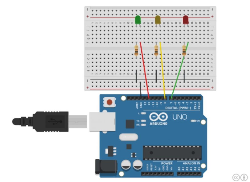 En aquesta pràctica muntarem un semàfor amb tres leds i les seves resistències i haurem de programar el funcionament d’un semàfor real.