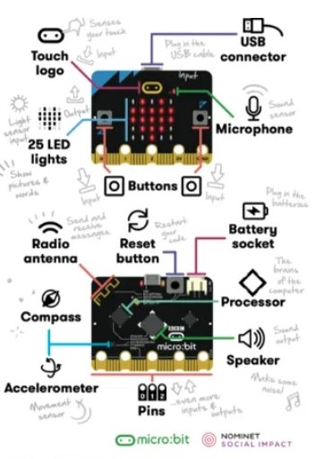 El micro:bit de la BBC és un ordinador de butxaca que us presenta com funcionen conjuntament el programari i el maquinari. Té una pantalla de llum LED, botons, sensors i moltes funcions d’entrada/sortida que, quan es programa, permeten interactuar amb tu i el teu món.