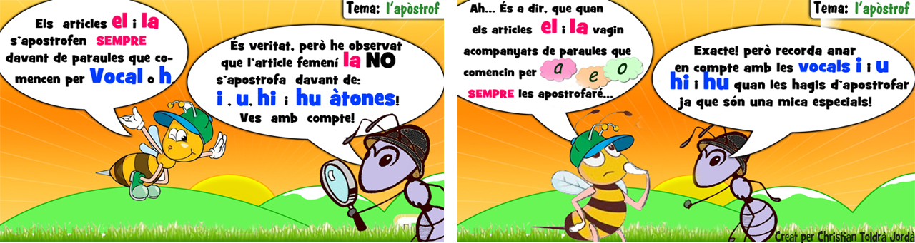 Aquí teniu una activitat per a practicar amb l’apòstrof. Si teniu algun dubte repasseu els apunts de la carpeta o potser si llegiu el diàleg de l’abella i la formiga de la vinyeta us ajuda una miqueta! Ànims campions i campiones si teniu cap dubte també estem els mestres, no cal dir-ho!